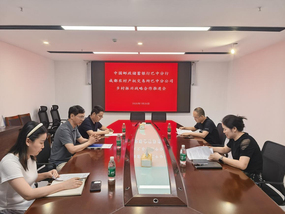 為充分發(fā)揮成都農(nóng)交所四川省農(nóng)村產(chǎn)權(quán)綜合交易平臺(tái)優(yōu)勢(shì)和郵儲(chǔ)銀行融資及其他綜合金融服務(wù)優(yōu)勢(shì),通過資源互補(bǔ)、信息互通、協(xié)作配合,共同推進(jìn)服務(wù)農(nóng)村集體經(jīng)濟(jì)組織和新型農(nóng)業(yè)經(jīng)營(yíng)主體的金融支農(nóng)工作。2025年7月25日下午,中國(guó)郵政儲(chǔ)蓄銀行巴中分行與成都農(nóng)村產(chǎn)權(quán)交易所巴中分公司、巴中市鑫匯農(nóng)業(yè)服務(wù)有限公司召開了鄉(xiāng)村振興戰(zhàn)略合作推進(jìn)會(huì)。