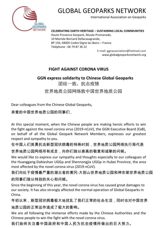 ? ? 在中國(guó)人們英勇抗擊新型冠狀病毒的特殊時(shí)刻,世界地質(zhì)公園網(wǎng)絡(luò)執(zhí)行局代表世界地質(zhì)公園網(wǎng)絡(luò)的所有成員,向你們致以崇高的敬意和誠(chéng)摯的問(wèn)候。